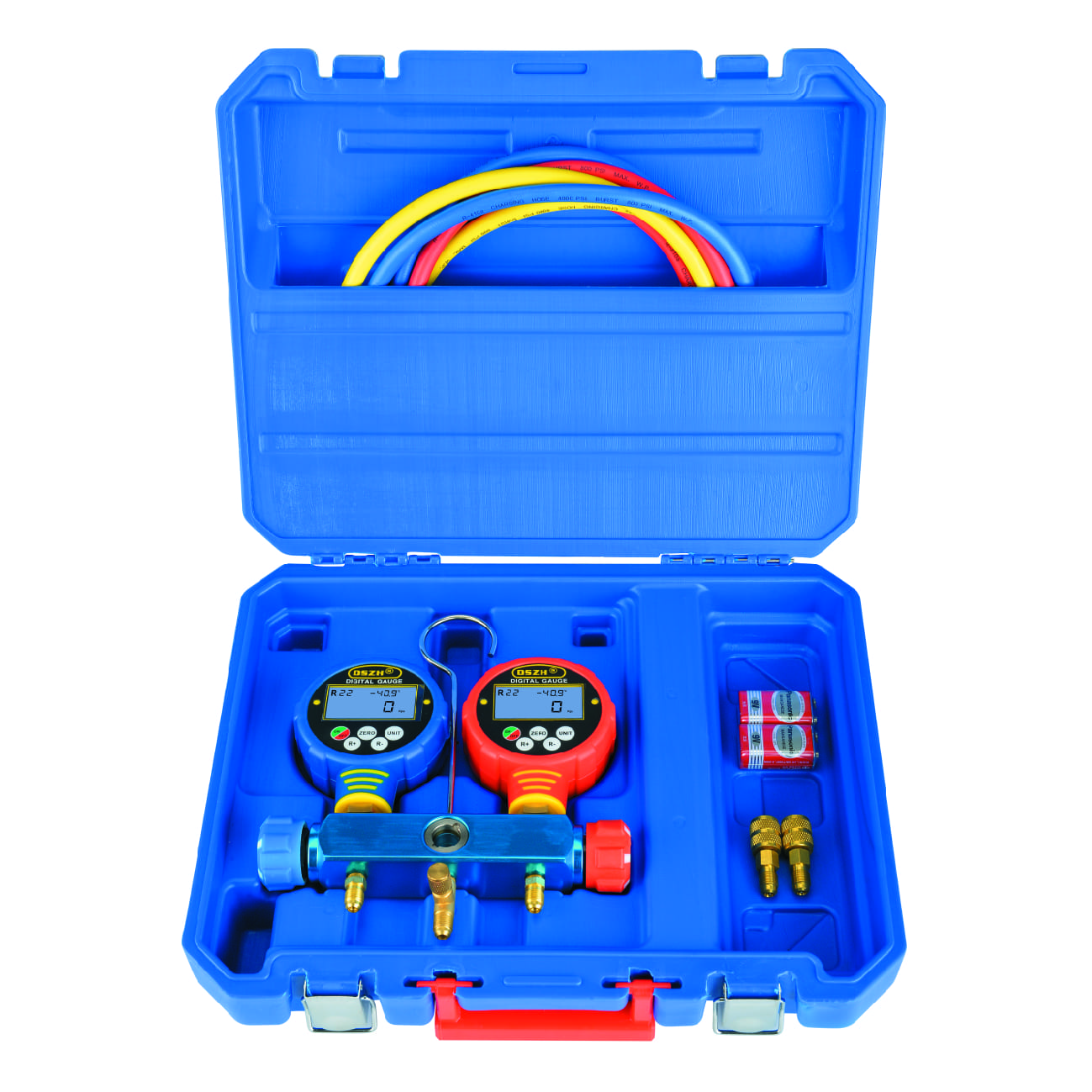 Цифровая манометрическая станция DSZH WK-6882L представляет собой двухвентельный цифровой манометрический коллектор с  комплектом из трех зарядных шлангов и смотровым стеклом, поставляется в пластиковом кейсе. Цифровой мановакуумметр WK-6882. В памяти у него температуры кипения по 82 хладагентам, можно изменять единицы измерения температуры (°C, °F) и давления (кПа, Бар, Psi, торр, кгс/см2, дюйм рт.ст., мм рт.ст.), можно переключать в режим вакуумметра (нажатием и удержанием клавиши "ZERO", в режиме вакуумметра не отображается хладагент и температура - только давление и показывает % от "полного" вакуума).