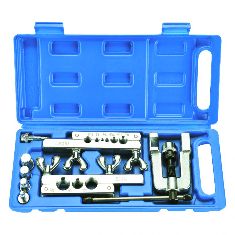 Развальцовка для медных, алюминевых труб с труборасширителями, или разбортовка медных труб, это инструмен холодильщиков и монтажников по кондиционерам для изменения формы медных труб, их сгибания, расширение для пайки. Вальцовка с расширителями для медной трубы модель CT-275 меняет геометрию с высоким радиусом для придания сгибу округлой формы для того, чтобы накрутить латунную гайку на 3-х ходовой порт кондиционера,а также чтобы паять трубу . Используйте вальцовку для медной трубы согласно диаметру. В компании "РМТ" большой выбор вальцовок DSZH.  В комплект входит: Вальцовка с эксцентриком 45 гр. Плашка с универсальным  отверстием под дюймовую трубу.Вальцовка CT-275 подходит для медных труб диаметров: 1/8",3/16",1/4",5/16",3/8",7/16",1/2",5/8",3/4", а также 5 насадок для труборасширения: 3/16",1/4",5/16",3/8",1/2",5/8",3/4. Проста в использовании и имеет точный результат развальцовки, благодаря фиксаторам и надежным креплениям. Инструмент DSZH хорошего качества.